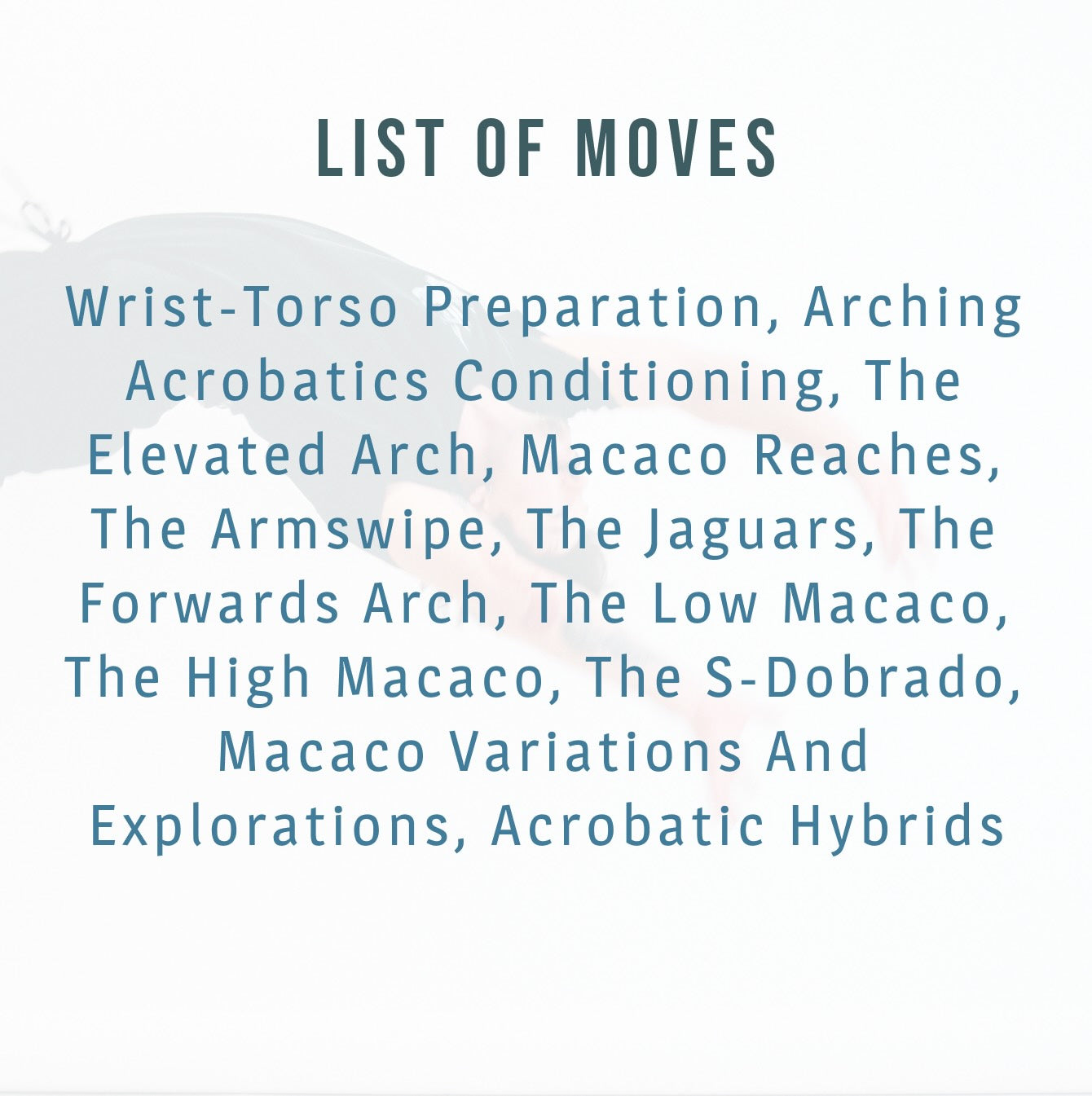 Wrist-Torso preparation, arching acrobatics conditioning, the elevated arch, macaco reaches, the armswipe, the jaguars, the forwards arch, the low macaco, the high macaco, the s-dobrado, macaco variations and explorations, acrobatic hybrids
