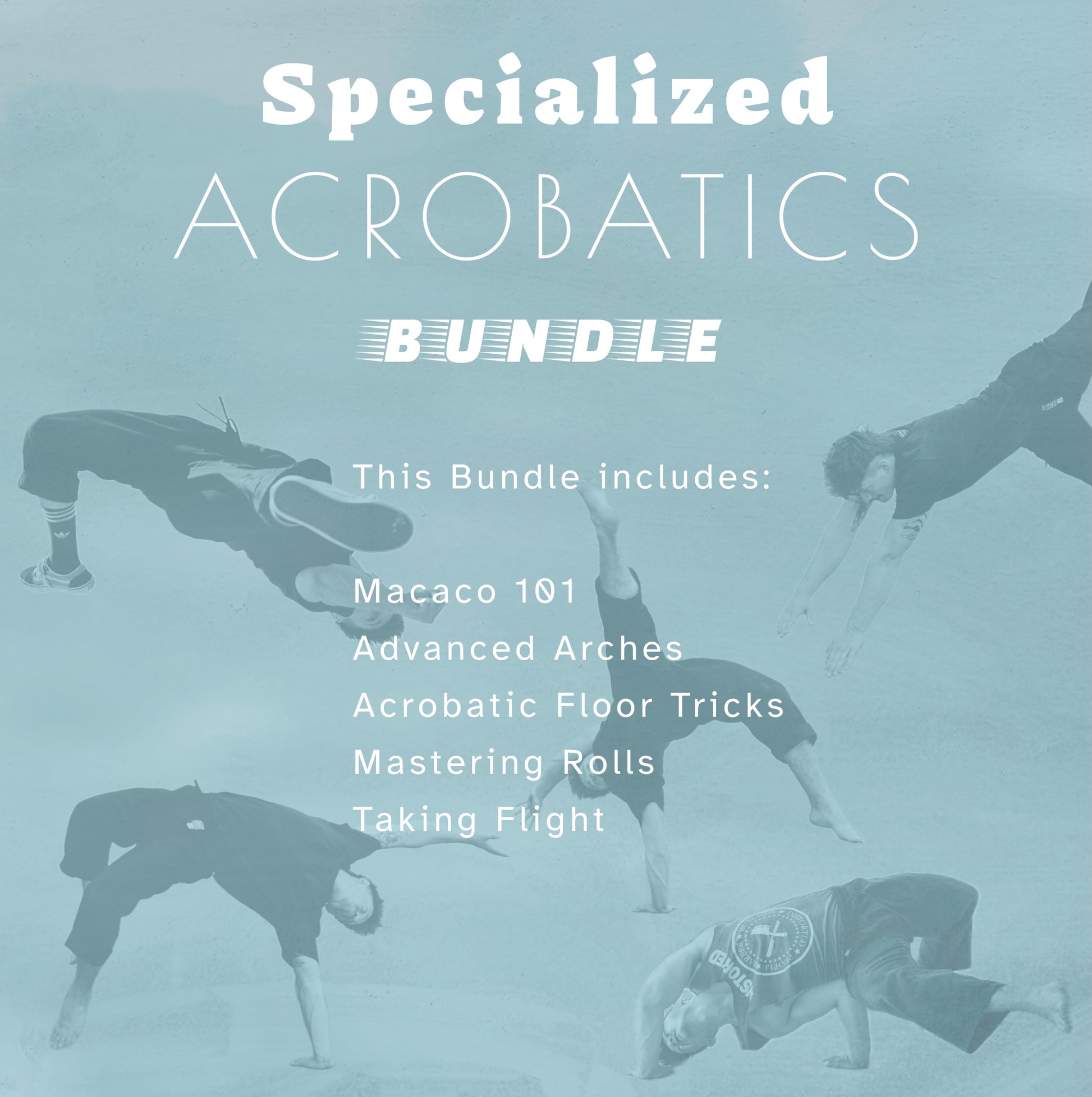 This bundle combines five focused programs—Macaco 101, Advanced Arches, Acrobatic Floor Tricks, Mastering Rolls, and Taking Flight—covering everything from dynamic ground skills to flowing rolls and explosive jumps and flips.